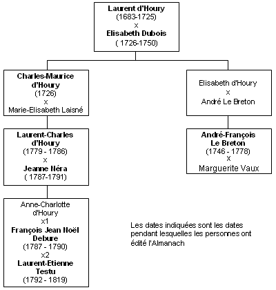 En 1728, la veuve d'Houry associe son petit fils, André-François Lebreton, agé de 18 ans, orphelin et jusqu'alors sous la tutelle de Charles Maurice d'Houry. André François avait hérité, selon la volonté testamentaire de Laurent d'Houry, de la moitié des droits de l'Almanach, et sa veuve du reste. L'Almanach prend un nouveau souffle et s'enrichi rapidement de nouvelles rubriques.